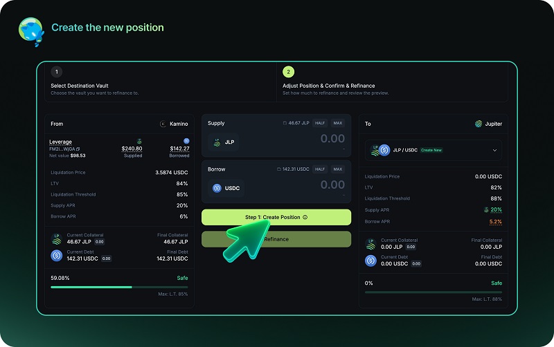 Accéder à Refinance se fait directement depuis l’interface Jupiter : sélectionnez l’onglet dédié, connectez votre wallet, et laissez le scanner vos positions ouvertes sur les protocoles supportés. L’écran affiche alors un tableau comparatif : APY actuel vs. meilleurs disponibles, impact estimé sur vos intérêts mensuels, et frais totaux (généralement <0,5% grâce à l’agrégation). Vous choisissez la cible – disons migrer un prêt SOL sur Kamino vers un emprunt USDC sur Marginfi – confirmez les paramètres (montant exact, collateral à ajuster), et signez une seule transaction. Ainsi, tout s’exécute en bloc : pas de risque de “half-migration” où vous remboursez sans pouvoir emprunter ailleurs.