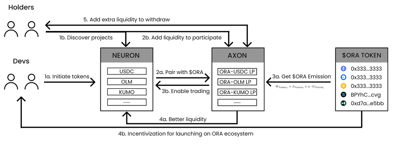 Difficile de causer ORA sans effleurer la tokenomics : le token $ORA occupe une place centrale comme médium d’échange, outil de gouvernance et levier d’incitation. À ce dernier s’ajoutent des Neurons (tokens dédiés à chaque modèle/système IA), qui forment avec $ORA des pools de liquidité baptisés Axons — chaque participant peut fournir de la liquidité et recevoir des récompenses en retour. Les autres usages du token $ORA incluent le paiement du “gas” entre protocoles et blockchains supportés, la gouvernance décentralisée et la capacité à valider/assurer la bonne exécution des modèles IA du réseau. Rien n’est laissé au hasard dans l’articulation de la valeur autour des contributeurs, utilisateurs, détenteurs, et curateurs de l’écosystème.