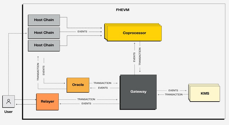 Pour pallier la lourdeur chronique de la FHE, Zama Protocol adopte une exécution symbolique : sur la chaîne principale, les smart contracts ne réalisent pas eux-mêmes les coûteuses opérations FHE mais produisent des références aux résultats. Ceux-ci sont calculés en parallèle par des coprocesseurs, des nœuds spécialisés qui assurent aussi la consignation, la vérification et la publication des résultats dans une logique décentralisée et transparente.